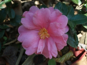 | Tall camellias I am quite pleased that several of the garden's camellias now tower above eight feet, with a few topping ten. Uppermost branching is not stocky, but even long, slender branches remain rigid in all but the dampest snowfalls. In this first week of November, many are flowering, unaffected by recent twenty degree nights. Though there are twenty or so camellias total, only a few with variegated foliage ('Royal Flush') are unusual at all. Most are autumn flowering hybrids introduced by the National Arboretum, with a handful of spring blooming Japanese camellias (Camellia japonica) that are more variable and less dependable to flower. I don't believe I've ever lost a camellia to freezing temperatures, but flower buds are occasionally damaged when winter temperatures drop below zero (Fahrenheit). | |