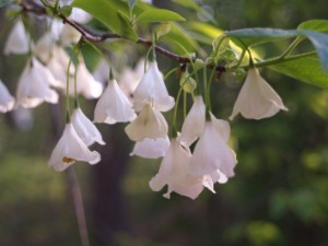 | Of course, more favorites Several redbuds and handfuls of dogwoods of various sorts are scattered about the garden. Most have been around since the garden's early days, and of course all are favorites (even hybrid and Chinese dogwoods that flower in May). But the weeks pass, and as blooms of dogwoods, redbuds, and serviceberry fade, the view out the kitchen window is filled by the aptly named, dangling flowers of Carolina silverbell (Halesia carolina). This splendid tree must also be a favorite, and sadly it is less common and certainly under utilized so that many gardeners are unaware of its beauty. While there are arguably too many trees in this garden (at least according to the assistant gardener, my wife), my mistake was planting only one silverbell .... | |