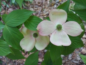 | No complaints I do not object that flowers of the 'Stellar Pink' dogwood (Cornus 'Rutgan') are barely shaded in pink, and most blooms appear nearly white in color. The same is true of the supposedly pink flowered 'Satomi' Chinese dogwood (Cornus kousa 'Satomi'). I've witnessed both with deep pink flowers in the much cooler northwestern states, and while there've been one or two cool springs in the past twenty when the color was somewhat deeper in this garden, I don't expect it. But, I thought, the past month has been cool and rainy, and perhaps there's a chance this year. Nope, barely pink. | |